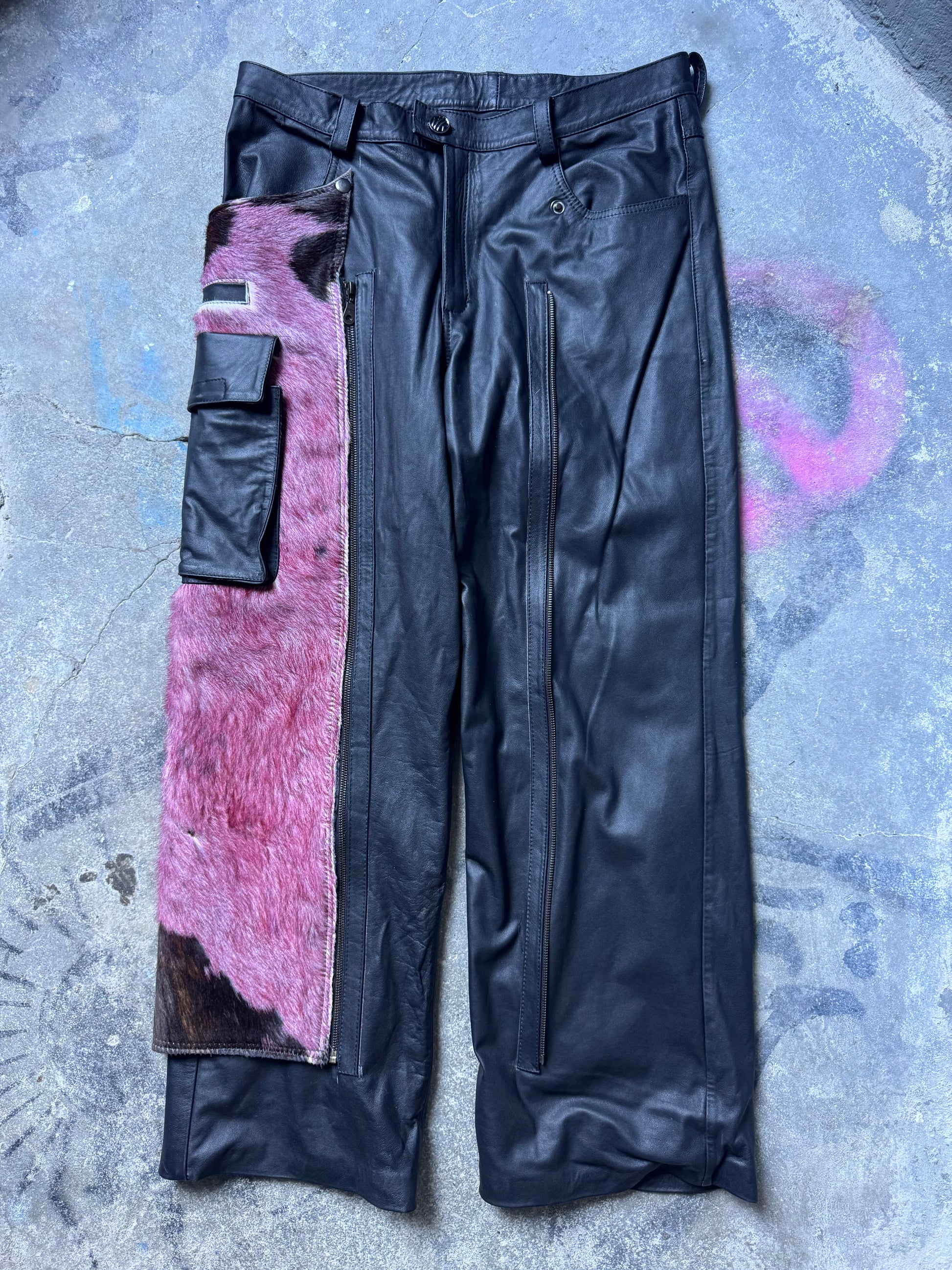 Pink cowhide cargo chaps