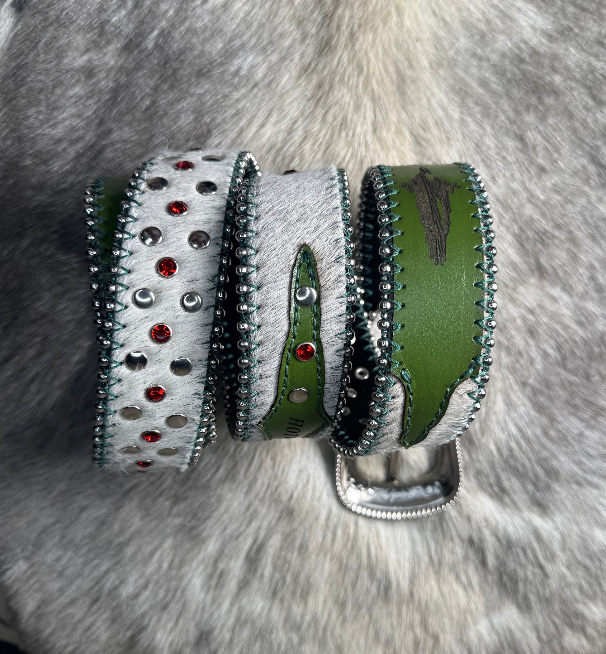 Each cowhide colorway item features a unique rhinestone color and pattern.