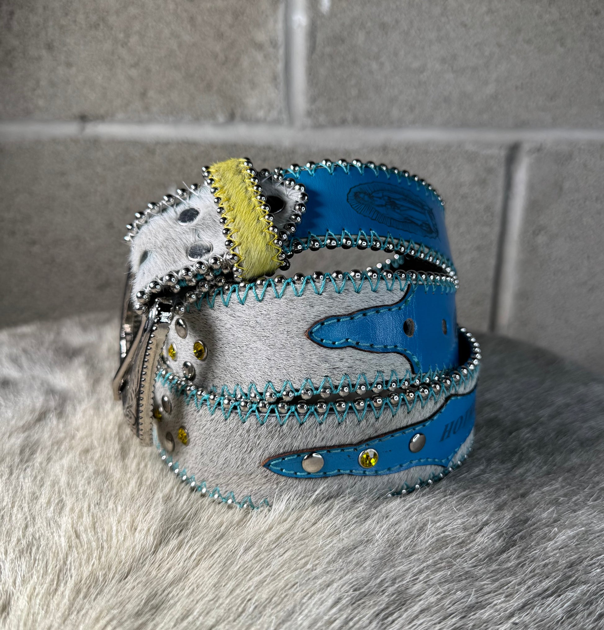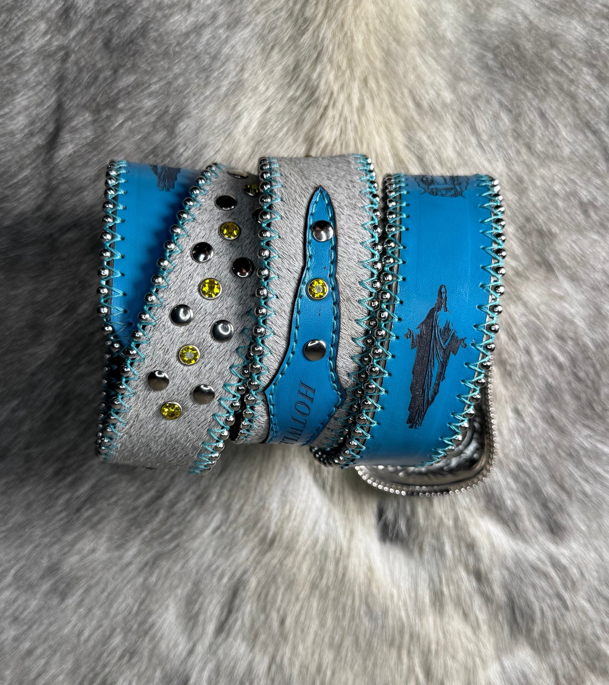Each cowhide colorway item features a unique rhinestone color and pattern.