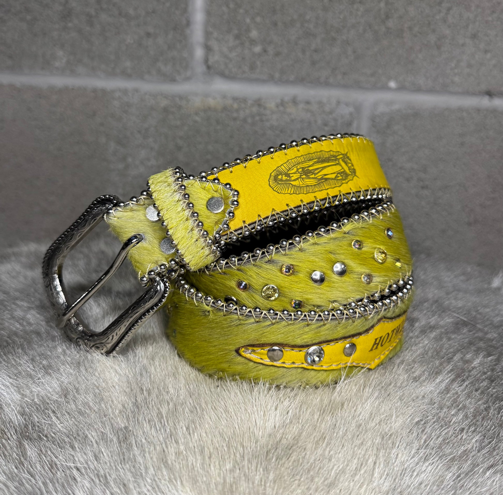 Each yellow cowhide colorway item features a unique rhinestone color and pattern.